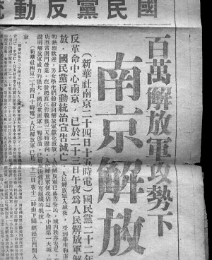 在人民解放軍的強大攻勢下,國民黨南京政府土崩瓦解,黨政官員倉皇南逃,駐防南京及蘇南各地的國民黨軍紛紛棄守而逃。各城市地下黨組織根據事先的布置,組織共產黨員和積極分子維護城市秩序,熱烈歡迎解放軍的到來。解放軍第8兵團第35軍于23日午夜進占“總統府”。5月1日,中共中央電賀南京解放,指出:“人民解放軍第二、第三兩大野戰軍執行人民解放軍總部司令,奮勇前進,橫渡長江,敵軍望風披靡,南京迅獲解放,國民黨反動派統治從此宣告滅亡,江南千百萬人民迅即重見天日,全國歡騰,環球鼓舞!