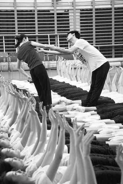 在纏綿的昆曲背景音樂中,一群著粉色T恤、頭發(fā)高高挽起的姑娘裊裊婷婷地舒展四肢,輕輕柔柔地轉(zhuǎn)身,低眉抬頭間,是那風(fēng)情萬種的笑靨……這是大型音樂舞蹈史詩《復(fù)興之路》第一章《山河祭》在中國農(nóng)業(yè)大學(xué)體育館的排練現(xiàn)場(chǎng)。
