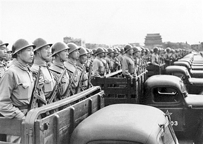 陸、海、空三軍佩戴統一制式的帽徽和胸章,著50式軍服受閱,整齊劃一,面貌一新。新中國成立后我軍第一次有了統一制式、統一標準的軍服。