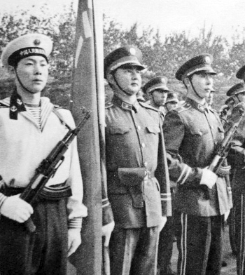 1984年國慶35周年閱兵,受閱陸海空三軍部隊全部換上85式新軍服:陸軍方隊的軍官全部著棕綠色毛料軍服,海軍方隊軍官著上身白色下身藏藍色軍服,空軍方隊軍官著上身棕綠色下身深藍色軍服。