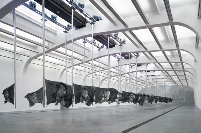 每天晚7點是尤倫斯當代藝術館閉館的時間。大展廳里震耳欲聾地響了一整天的鼓風機停了。34 幅被吹得呼啦啦飄揚的旗幟以及旗幟上34 張嬰兒的臉也隨著風力消失,癱軟下來,耷拉在旗桿上。仿佛大退潮,展廳盡頭的灰色風景墻露了出來,那面墻上畫著沒有人煙的山頭。遠望去,旗桿如墳墓上的旗幟,遍插山地。