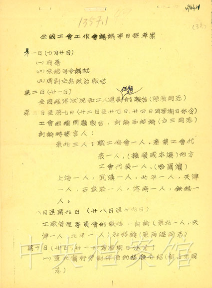 1949年7月23日至8月16日,全國工會工作會議在北平舉行。出席會議共有省、市、區72個單位的代表254名。毛澤東、朱德、周恩來等先后到會講話,李立三作了關于工會組織的報告。這次會議規定了當時全國工會工作的中心任務,就是在一年左右基本上把全國工人階級組織起來,以便在新中國的政權建設和經濟建設中勝利地擔負起領導階級的歷史使命。會議通過了《關于勞資關系暫行處理辦法》等四個文件,明確了在新民主主義政權下處理勞資關系的正確途徑。