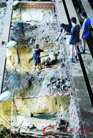 站在觀望臺向下俯瞰,在長60米、寬40米、高12米的世界首個室內搶救水下文物的特殊海水“水晶宮”內,露出的這只長30.4米、寬9.8米、高逾4米且銹跡斑斑的鐵沉箱里,就是令世人矚目的“南海Ι號”船體。廣東省水下考古隊的10名考古工作人員正在做第一階段最后試挖掘收尾工作。