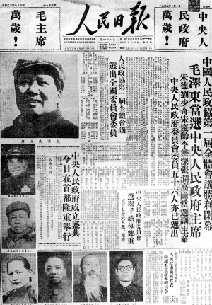 “ 中華人民共和國的誕生與中央人民政府的成立,是中國幾千年來歷史上一個劃時代的偉大事件,被帝國主義、封建主義、官僚資本主義所統治的舊中國的歷史時代已經結束,人民民主的新中國正開始其新的紀元。中國人民已由過去被壓迫被剝削的奴役地位,一躍而為現在管理國家政權的主人翁。占人類總數四分之一的中國人,從此在地球上站立起來了!”