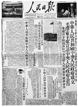 “ 共產黨的新聞機構報道,約二百萬人聚集在一起收聽這個歷史性的宣告,所有人的目光都聚集在毛澤東升起的那面新中國的標志——五星紅旗,樂隊演奏新國歌《義勇軍進行曲》。其后,舉行游行儀式。軍隊接受朱德將軍的檢閱,編隊經過天安門,有的配備最新的美國大炮、坦克以及從國民黨手中繳獲的裝甲車。共產黨空軍轟炸機編隊飛行,煙花爆竹和其他游行活動直至深夜。有報道指出,這種歡慶活動將持續3天左右,與推翻清政府統治的‘雙十節’共慶。”