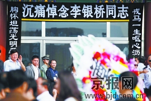 今天上午10時,毛澤東衛士長李銀橋追悼會在八寶山殯儀館舉行。李銀橋生前同事、友人和眾多滿懷對老人崇敬之情的市民參加了遺體告別儀式。李敏、毛新宇等毛澤東親屬也來到追悼會現場。