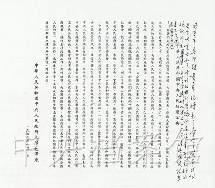毛澤東主席莊嚴(yán)宣布:“中華人民共和國(guó)中央人民政府已于本日成立了。”并且親手升起國(guó)旗——五星紅旗。升旗儀式后,毛澤東宣讀《中華人民共和國(guó)中央人民政府公告》。