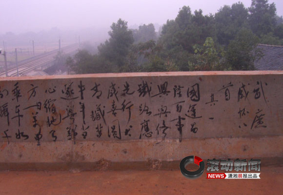 “太有才了!如此流暢的書法作品,的確為鐵路建設(shè)增色不少。”網(wǎng)友“龍?zhí)t”在紅網(wǎng)論壇發(fā)《水泥墻上見功底武廣橋上一奇葩》,帖中曝料他在武廣高速鐵路客運專線上的一跨線橋的擋墻上,拍到建橋人如行云流水一般的書法作品。據(jù)當?shù)刂槿苏f,這些書法作品是其中一位承建包工頭建完橋后有感而書的。