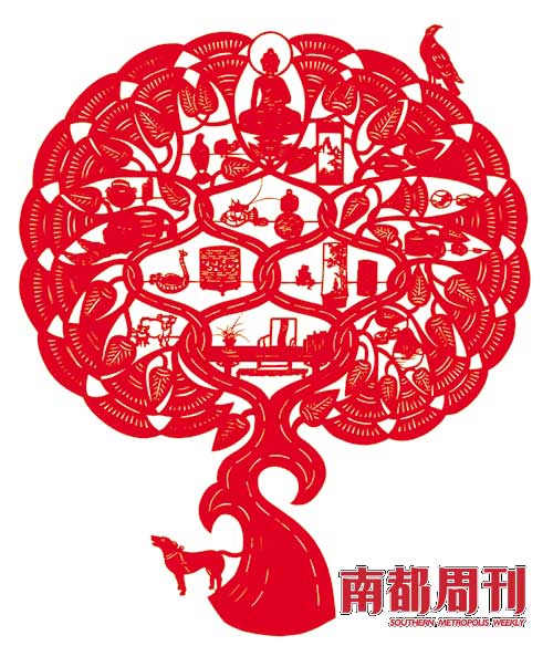 袁荃猷女士刻的這幀“大樹圖”剪紙,形象勾畫出了王世襄一生的15種愛好,這其中有代表王世襄最主要學術成就的漆器,還有王世襄使之死而復生的傳統工藝竹刻、葫蘆器,還有繪畫、鎏金銅佛像、蟋蟀、家常菜、大鷹、獾狗等。