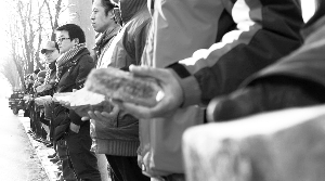 12月20日下午,北京008國際藝術(shù)區(qū)(以下簡稱008藝術(shù)區(qū))門口,30余名藝術(shù)家站成兩排,手持從拆遷廢墟中撿來的磚頭,眼睛死死盯著遠方,足足站了1個小時。