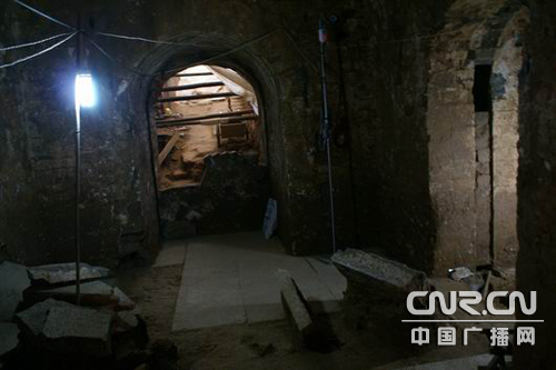 12月19日和25日,記者兩次來到發掘現場高穴村二號墓地——安陽縣安豐鄉西高穴村南地一片開闊的田地里,了解了“曹操墓”的來龍去脈。曹操墓規格相當高,呈中字型土坑式磚石墓室,墓室分為前室和后室,中間有甬道相通,前后室頂部為四角攢頂,甬道為磚券拱形頂。前后墓室東西兩側各有一個耳室。兩座墓室最深處距地表16米,屬于典型的深埋墓葬。 墓道長35米,寬9.6米,呈階梯式內收。