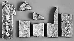 墓地出土(或從盜墓賊處繳獲)的石牌和石枕,有關方面認為是根本性的確證。圖一中有兩塊石牌寫著魏武王大戟,這是很有意思的,因為我們看到的是石牌不是武器戟本身。牌子是說明實物的,如何根據牌子證明這就是曹操的墓地呢?牌子上面寫著魏武王常用格虎大戟,表明這是在說明商品的名稱,而不是說這是曹操的遺物。再看圖二計21枚牌子,這些牌子上面都有孔,以作懸掛用,上面寫的多是物品名數,如胡粉二斤、黃豆二升之類。如果把這些看成是遺物陪葬,那就不免奇怪了。因此這些所謂遺物應該是陳列的商品招牌,那么這幾間陰室要么是做過倉庫,要么就是堆放過商品。而這些牌子只是為了說明記錄這些貨物用的。從稱呼上看,曹操生前先封為“魏公”,后賜九錫,進爵為“魏王”,死后謚號為“武王”,其子曹丕稱帝后追尊為“武皇帝”,史稱“魏武帝”。出土石牌、石枕刻銘稱“魏武王”,名稱倒是不錯,但石枕形貌不是生活中可以適用的物品,應該出自偽造。從物品所刻字體看,刻工水平很差,所以只能是來自民間藝人所作,因為從盜墓人手中獲取,也不排除盜墓人游戲之作。