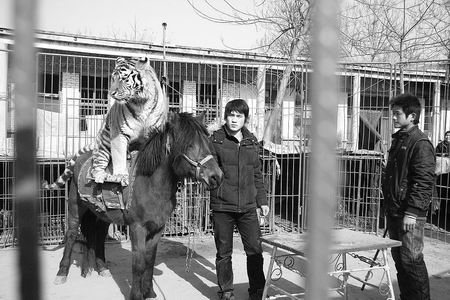 梅莊的馴虎人幾乎都是走南闖北的能人,他們的行期和路線都是按照各省大大小小的知名集會(huì)、廟會(huì)及各類地方性節(jié)日安排的。梅莊訓(xùn)練出的老虎一般都會(huì)10個(gè)左右的節(jié)目,如騎馬、鉆火圈、踏美女、走梅花樁、拉車等。談起馴成虎的“走穴”經(jīng)歷,胡敬才的大兒子胡衛(wèi)平感觸最多:“每到一處都要租場(chǎng)地、扎大棚,如運(yùn)作不好,連虎食都賺不回來(lái)。”