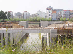 記者趕到西廣場(chǎng)時(shí)發(fā)現(xiàn),遺址上是一片火熱的施工景象,現(xiàn)場(chǎng)堆滿了各種建筑材料,幾十個(gè)工人穿梭忙碌,工地上還可以見到類似砌城墻所用的巨大條石。從廣場(chǎng)西邊的外秦淮河邊望去,新建的混凝土水閘幾乎東西向貫通遺址,已經(jīng)基本成形。現(xiàn)場(chǎng)一位工人告訴記者,這里將建一個(gè)賞心亭,水閘還將穿過馬路,連通內(nèi)外秦淮河。