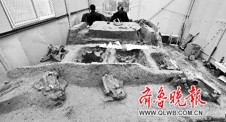 省文物考古研究所所長鄭同修介紹,車馬坑及馬坑等重要遺跡整體起取至濟南后,就采取了初步的防護措施,建設了臨時保護和工作用房,制定了保護工作方案。