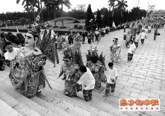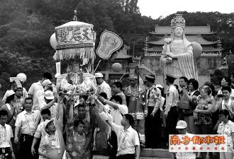 下午1時40分許,從臺灣專程趕來的500信眾,手捧數十尊天后像隆重入場祭拜。他們穿著傳統服裝,攜帶各種旗幟及獅陣、太子陣、將爺陣等隊形進入天后宮。據說,昨天午后1時40分是拜祭媽祖的吉時。據悉,今后臺灣信眾有望繼續前往南沙天后宮參加媽祖誕。