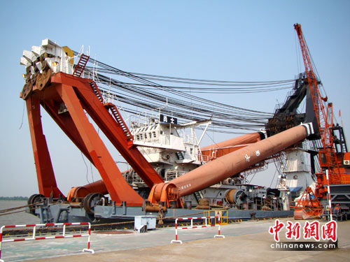 中新網鎮江5月24日電(盛如平 董文浩 朱曉穎)24日,江蘇鎮江焦山“瘞鶴銘”殘石打撈在即,“勇士”號浮吊船抵達并停泊在索普碼頭,等候進入打撈作業水域。