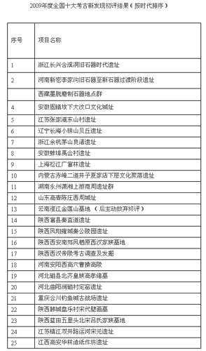據介紹,今年的初評由國家文物局考古專家組成員、中國考古學會104位理事和63家全國考古發掘資質單位共同投票,從60項候選項目中按得票數產生25個發掘項目入圍(名單附后),參加2009年度全國十大考古新發現終評評選。
