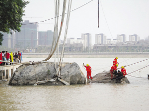 4股共8根白色的“繩子”從空中吊臂上垂下,已經(jīng)將一塊露出水面最多的不規(guī)則疑似巨石牢牢“網(wǎng)”住。“勇士”號(hào)打撈船現(xiàn)場(chǎng)總指揮王雷告訴記者,打撈船自身重達(dá)萬(wàn)噸,這8根白色“繩子”應(yīng)該叫“高強(qiáng)度尼龍纜繩”,每根比一個(gè)成人的手臂都粗出許多,是由特殊材料定制的,造價(jià)不菲。“勇士”號(hào)上月28日進(jìn)入打撈水域后,就開(kāi)始馬不停蹄地為打撈做前期準(zhǔn)備,近50名專業(yè)打撈人員,輪換潛水進(jìn)入江底巨石所在位置,進(jìn)一步清淤后又用高壓設(shè)備沖泥,這樣將巨石臥江位置沖出一定空間。再將高強(qiáng)度尼龍纜繩穿過(guò)石體,到昨天才剛剛固定完畢。記者問(wèn)他,這些專業(yè)人士潛入江底,能否看到石塊上有字跡或其他古跡。王雷說(shuō),“潛下去后,水下的能見(jiàn)度為零”,同時(shí),因?yàn)閷I(yè)人士全身著特定的潛水打撈衣,手也無(wú)法感知。所有一切疑問(wèn)及待解之謎,看來(lái)只有留待巨石出水之時(shí)解開(kāi)了。