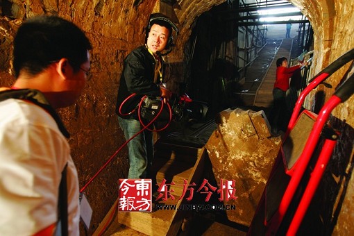 在墓穴底部,有一堵高約1米的土墻,記者注意到,墻內鑲嵌著一些磚瓦片,已經露出。據考古人員介紹,在12日的發掘中,考古人員極有可能剝開該堵墻,至于有無重大發現,值得大家期待。