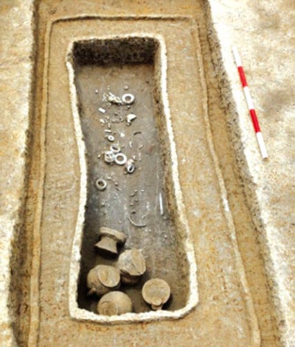 據(jù)介紹,今年3月初,浙江省文物考古研究所和余杭博物館聯(lián)合對玉架山遺址繼續(xù)進(jìn)行發(fā)掘、探索。本年度發(fā)掘至今,清理良渚文化墓葬32座(共200座);可能存在房址的東北角附近已著手發(fā)掘。依照計劃尋找遺址對外通道,解剖了環(huán)壕東北角向北延伸的部分(鉆探時推測為北通道),獲知解剖點(diǎn)的北通道寬約9.5米,深1.5米。在距北通道西側(cè)約30米處發(fā)現(xiàn)了另一小遺址,清理了一條東西向小溝(局部),在小溝的北岸壘有一些石塊,并發(fā)現(xiàn)了良渚文化晚期小墓墓地,暫時清理了其中一座。