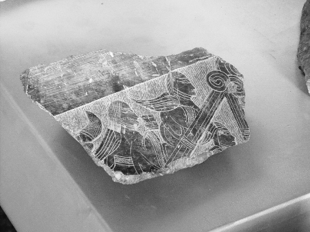 專家孫新民說,該銘牌是在鋪地石的下面發現的,是用犀器做的盾牌。