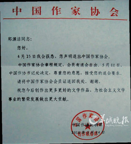 中國作協(xié)發(fā)給鄭淵潔的信中寫道:“5月11日,中國作協(xié)書記處決定,尊重您的意愿,接受您的退會(huì)要求。請(qǐng)將中國作家協(xié)會(huì)會(huì)員證退回我處。謝謝。祝您創(chuàng)作出更多更好的文學(xué)作品,為社會(huì)主義文學(xué)事業(yè)的繁榮發(fā)展做出更大貢獻(xiàn)”。信的簽章是“中國作家協(xié)會(huì)創(chuàng)聯(lián)部”,落款日期為6月4日。