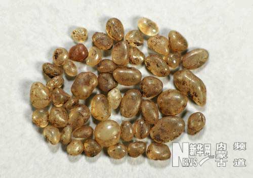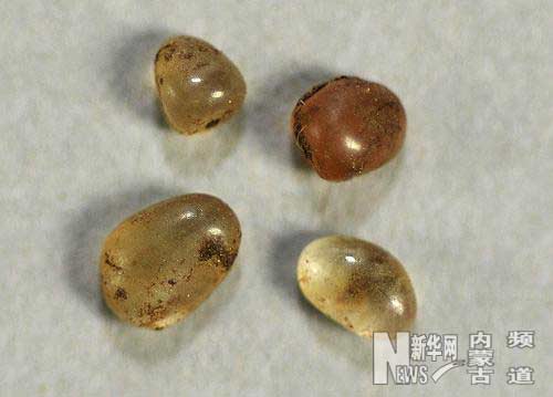巴林左旗遼上京博物館發現的其中四顆佛舍利(6月4日攝)。內蒙古赤峰市巴林左旗遼上京博物館于“文化遺產日”當天向社會披露,近日在進行館藏珍貴文物數據采集拍攝文物時,在當年出土于遼上京遺址北塔天宮的琉璃瓶內發現48顆罕見佛舍利子。新華社發(龐雷攝)