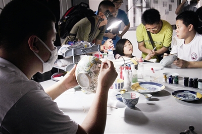 現場修復間與外面的文物展示區僅隔一道玻璃,觀眾在展示區參觀圓明園出土瓷片和老照片時,也可以近距離觀看文物修復過程。