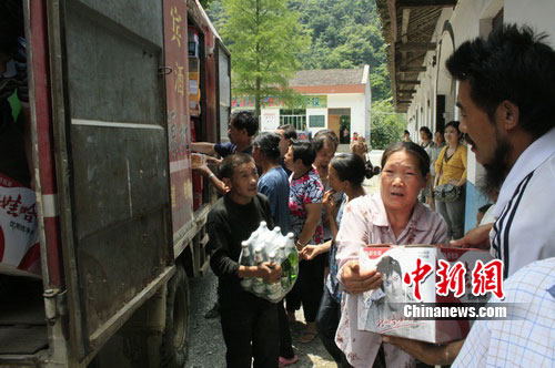 圖為21日陜西嵐皋縣四季鄉月壩村村民領取救災物資。 作 者:劉濤
