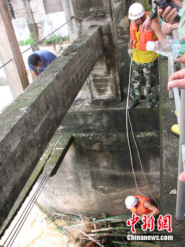 大壩閘門下,水深近6米,水流異常湍急,洪水也異常冰冷,且堆滿了垃圾,雖然消防官兵做好了安全保護,并關好閘門,下游也安排了漁船隨時準備救人,但是水下的情況不明,一不小心就有被洪水沖走或被水下雜物扎傷的危險。在其中靠近岸邊的一個孔閘門,大樹與竹子卡在閘門的中間,閘門無法放下,消防官兵只能在異常湍急的水流中作業(yè),由于缺少著力點,水下的消防官兵多次沒入水中,險象環(huán)生,經(jīng)過近20多分鐘的作業(yè)才將雜物捆住。