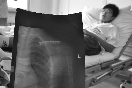安頓好兒子后,房女士和丈夫就悄悄離開了學(xué)校。“你們孩子傷著了,你快到醫(yī)院吧!”不到10點,學(xué)校的一個電話把房女士嚇壞了。兩口子趕緊趕到濟南一零六醫(yī)院,兒子小吳正躺在病床上,頭部左半邊有瘀傷,左肩鎖骨骨折,需要馬上手術(shù)。