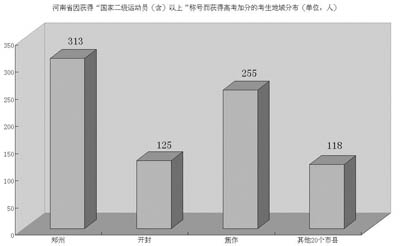 統計還發現,田徑、籃球、足球三項加分考生在各地市分布比較平均,而健美操、無線電測向和定向越野卻集中在成都、綿陽和南充3市,共為500人,占這三項加分總人數的78%。