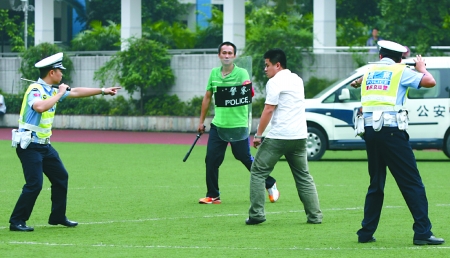 15時07分,一輛警車開進操場,8名全副武裝的飛龍突擊隊員跳下車門,迅速包圍操場中央圓弧。他們身穿多功能戰術背心,頭戴防彈頭盔,手握沖鋒槍,大腿外側還佩戴著手槍。“放下兇器”,一名突擊隊員通過擴音設備兩次喊話,但兩名持刀男子拒不就擒。
