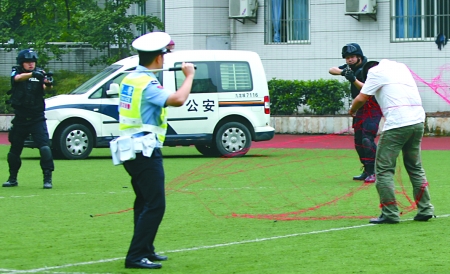 兩持刀男子沖進九龍坡區一小學,揮刀砍向攔阻他們的校園保安。正在危急時刻,端著沖鋒槍的飛龍突擊隊迅速出擊,兩張由網槍射出的紅色大網從天而降,將兩名男子圍住。5分鐘后,兩名持刀男子被擒獲。昨日下午,九龍坡區公安分局在天寶實驗學校進行了“飛龍2號”校園暴力事件處置演練。
