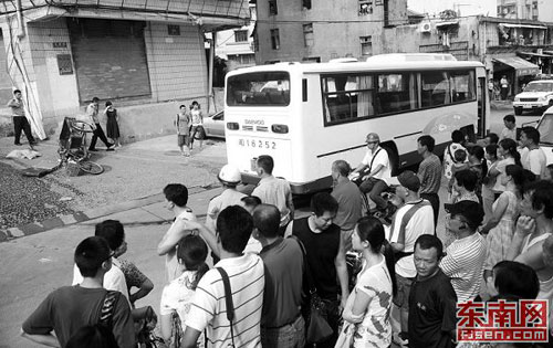 住在路邊四樓的周小姐目睹了車禍發生的經過。她告訴記者:“當時我正站在陽臺邊梳頭,大約7:50的時候,一輛大客車從西邊開過來,車速不是很快。開到我樓下時,我看到車撞到了一個小女孩和一個老人,然后車子又繼續往下開,緊接著撞到一前一后兩名婦女,又撞到一名騎著三輪車的男子,最后左轉彎停下了。”