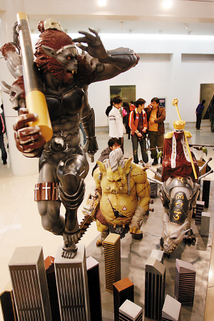 在展覽的最顯著位置,從川美畢業(yè)才兩年的“黃漂”王冕所做的雕塑作品“NEW YORK”引起了參觀者的格外關注,記者注意到,在這件作品中,唐僧的坐騎白龍馬加入了西方龍的造型,顯得有些面目可憎,而身上還貼滿了大眾、轟達等商標。唐僧也成了蒙面人,孫悟空長了四只手,豬八戒肥碩的手臂上蓋上了“驗訖肉檢”四個大字,而走在最后的沙僧擔子上挑的也不再是行李,變成了麥當勞和重慶百貨的購物袋,四人如此游紐約,想起來就讓人忍俊不禁。