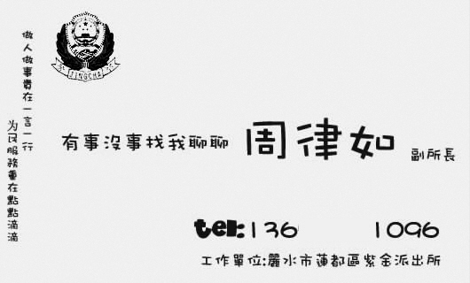 “有事沒事找我聊聊。”學(xué)生周律如設(shè)計(jì)的名片上用活潑的美術(shù)大字寫了這么一句話,落款是自封的“周律如 副所長(zhǎng)”!昂呛,副所長(zhǎng)當(dāng)然只是假想,不過我覺得要多和群眾接觸,才能做好服務(wù)嘛,所以我就這么設(shè)計(jì)啦!”小周說。