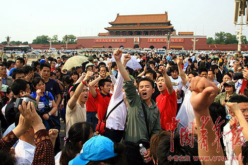 5月19日下午,天安門廣場上聚集了數(shù)萬名參與哀悼活動(dòng)的群眾,在默哀完畢后,此起彼伏的“中國萬歲”、“中國加油”的聲音響徹云霄。幾名四川籍在京大學(xué)生用四川話激昂高呼“四川雄起”,在場的四川人奮起響應(yīng),很快,來自全國各地的人們都受到強(qiáng)烈的震動(dòng),一起吶喊起來,一聲聲感人肺腑的吶喊聲在天地間回蕩,一雙雙舉著國旗的手臂在廣場上有力的揮舞,廣場漾起了一片血色的愛國暖潮。