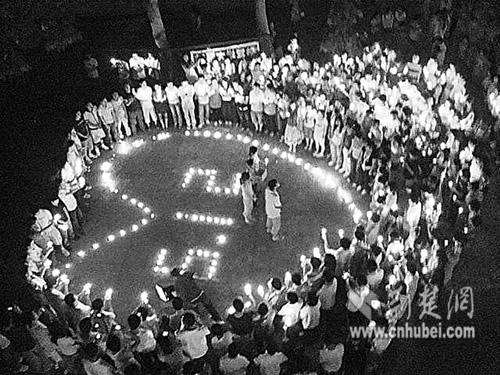宿舍樓下,燭光組成大大的愛心和“5.12”字樣;500余名學(xué)生手捧蠟燭,為罹難同胞祈禱。前日晚,武漢工程大學(xué)武昌校區(qū)的一場畢業(yè)聚會,顯得如此凝重。