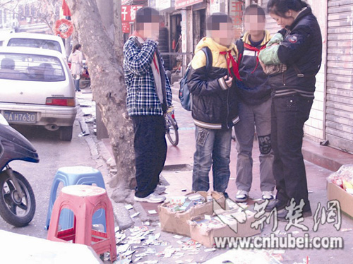 26日下午4時許,記者來到鄱陽街小學斜對面的一家副食店,門口丟著許多刮過的廢棄彩票。3名戴著紅領巾的男生圍著副食店的老板娘(如圖),其中一人掏出2元錢,買了4張彩票,現場刮開沒有中獎,嘆了口氣準備離開。記者上前詢問該男生,他說,只要5角錢就能買一張彩票,揭開就有可能中獎,獎金從0.5元到100元不等。