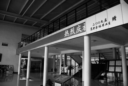 昨天下午,記者來到位于寧波市環城北路的教育學院。走進教學樓大廳,正上方鑲嵌著一塊大約十來米長,半米寬的電子顯示屏,屏幕的右邊則鑲嵌著 “二00九屆高職全體畢業生贈”的金字。
