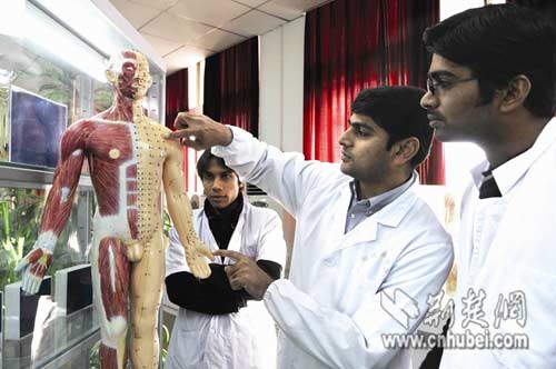 據李奇介紹,他們每年的學雜費加在一起是3200美元左右,對于這些家庭不是特別富裕的留學生來說,是一個不小的負擔。“我們很敬仰中國的醫學。”來自印度的李國偉告訴記者,他們國家也有中醫院,但都沒有中國的專業,也沒有專門學習中醫的大學,從小立志從醫的李國偉很早就有了來中國學醫的愿望。幾年前,他的一個朋友到中國蘇州學醫后,放假回家時跟他描述自己的見聞和所學的知識,更讓李國偉堅定了信念。在家人的鼎力支持下,2006年他和哥哥李奇來到了中國。