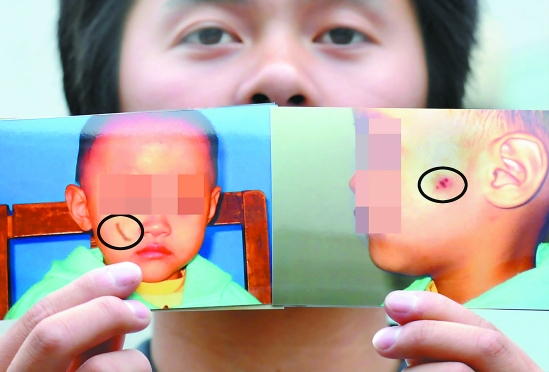 可10月20日發生的一件事,徹底激怒了小徐夫婦。那天,小徐去接女兒回家,發現女兒臉上竟然有三個血痕,一看就知道是小孩的牙印。“我當時真是氣不打一處來,孩子送到托兒所本來是買個放心,可現在卻弄成了這樣。”