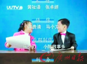 在《幼聞聯播》中,我們看到了與央視《新聞聯播》幾乎相同的畫面,左上角標著臺標“UUTV”,下方畫面從左到右分別寫著:“中國幼兒電視臺”、“幼聞聯播”及日期。畫面正中,正襟危坐著男女小主播“張卓妍”和“黃祉語”。在與《新聞聯播》相同的開場白后,兩個小主播開始播報新聞簡介,接著畫面轉向了由幼兒園小朋友們拍攝的“新聞畫面”,有紅豆幼兒園園長會見白豆幼兒園園長噢·斑馬,雙方簽訂《紅白聯合聲明》;有幼兒園怎樣預防H1N1流感……在播放《我園小朋友玩具船被搶,對方身份不明》新聞時,還非常專業地回放了監控錄下的“搶劫”現場畫面,用圓圈標識可疑人物。更搞笑的是,新聞播報結束后,兩個小主持居然也像央視主持人般,拿起桌上的新聞稿一邊整理一邊互相交談,而后邊的字幕也很“央視”,“記者”包括了白小松、韓小生、敬小丹等。