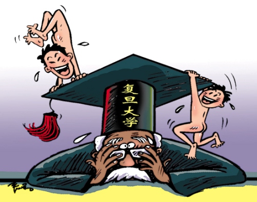 日前,兩名畢業在即的復旦男生,頭戴學士帽在校園內裸奔慶祝畢業,并拍照留念。 (昨日《羊城晚報》)