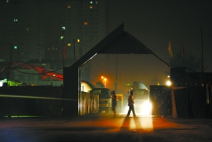 昨天深夜11時許,記者在望京東湖灣小區東門看到,這里的在建工地燈火通明,響聲一片,距離已經入住的居民樓不過百米遠。記者隨即繞行到小區南門發現,一輛掛著“甘”字車牌的水泥攪拌罐車順著坑洼不平的馬路,駛離了工地。此時,工地大門大敞著,工地內另一輛水泥攪拌罐車打著雙閃待命,工地中機械轟鳴聲不絕于耳,還不時地傳出施工車輛“嘀、嘀、嘀”的倒車聲,直至今晨零時記者離開現場時,夜間施工仍未停止。