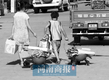當天下午5時,姐弟倆將廢品進行簡單地分裝后,分裝到兩輛小童車上,姐姐把紙箱里裝不下的飲料瓶提在手中,和弟弟拉著小車向小區外的廢品收購站走去。