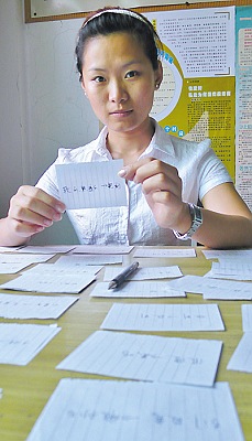 北方人難聽懂南方話,更難學重慶的地方土話!在萬州區龍沙鎮龍安村任村委黨支部書記助理的遼寧籍大學畢業生李飛就是其中一個,她是去年考上我市的“村官”。在9個月的“村官”生活中,她因不懂當地土話鬧過笑話,遭過白眼。因此,她不停地觀看帶有重慶方言和土話的電視劇進行模仿,寫了230頁土話“名片”隨身帶,天天念。