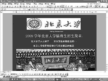 中凰天龍發來的招生簡章介紹說,北京大學插班生是指跟隨北京大學全日制本科生一塊學習、活動,僅是一次享受北大的文化氛圍,提升自身的知識水平的學習過程,畢業只頒發結業證,不屬于統招范疇。學生擁有聽課證,可以選擇專業跟讀。除了給招生代理公司交中間服務費外,學生還要向學校交學費7000元 /年、學雜費3000元、床位費500—600元/月等多項費用。